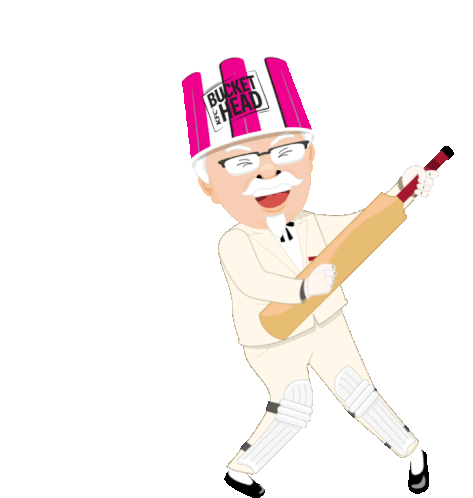 Colonel Sanders, wearing a KFC bucket hat and cricket gear, smiles while holding a bat in a batting stance for KFC Australia.