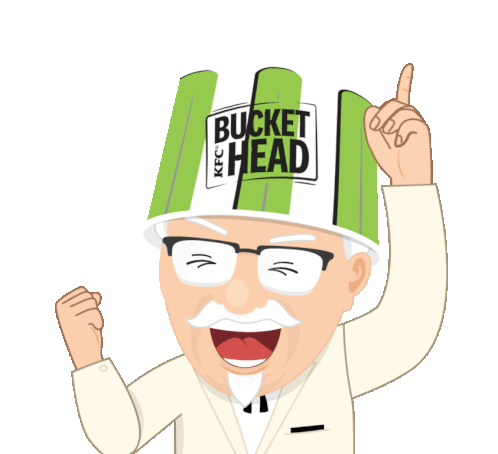 Colonel Sanders, the KFC mascot, wears a 'Bucket Head' hat, cheering enthusiastically for KFC Australia.