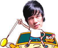 Khanhphuongafang Kpf as a cartoon character holding a golden spoon, standing on a 'KUSO PARTY' car.