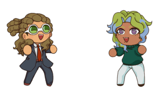 Chibi Kidou Yuuto and Mizune Shingo dance happily, with a sparkling pink heart appearing between them.