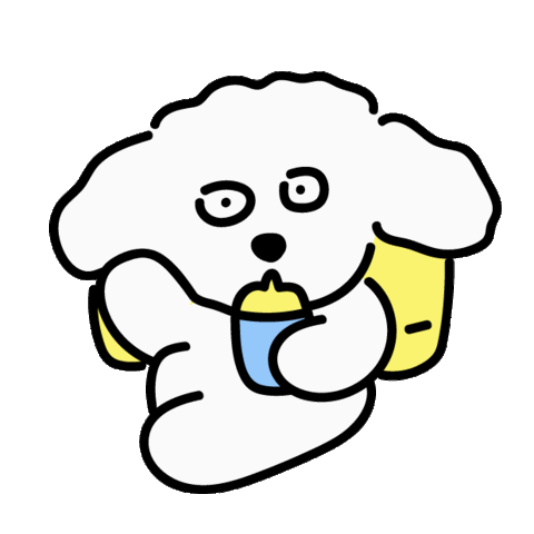 A cute, fluffy white poodle with a yellow backpack drinks from a blue and yellow baby bottle.