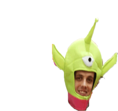 A person's head wearing a bright green alien hat with one eye and pointed ears, smiling, associated with Kiev Alien.