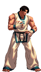 Kim Kaphwan from King Of Fighters 13 in a dynamic martial arts pose, wearing a white gi and blue accents.