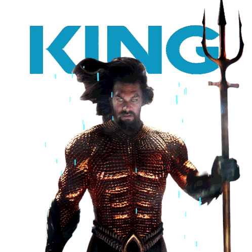 Jason Momoa as King Aquaman, powerfully holding his trident with the word 'KING' above, embodying the DC Comics hero.