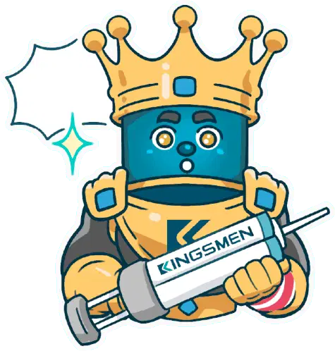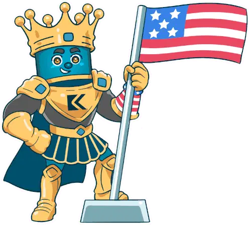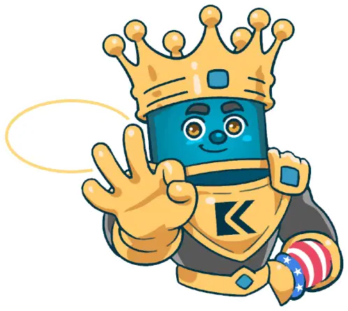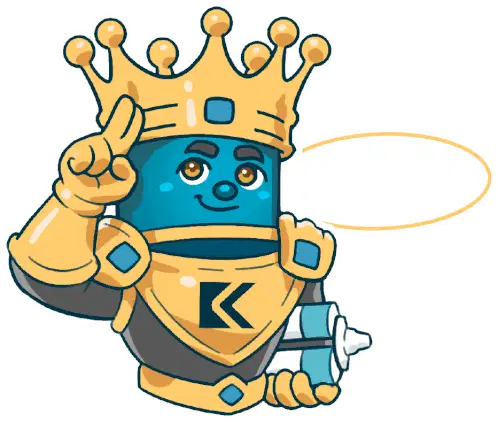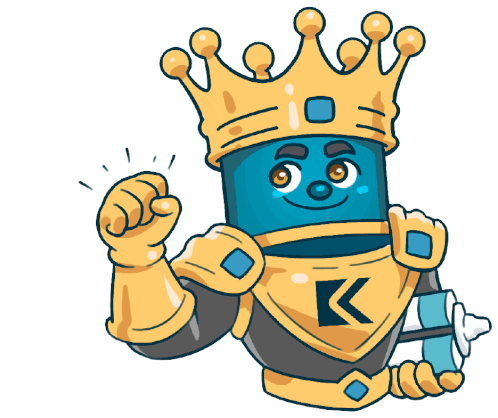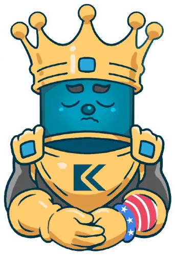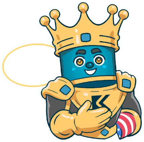 A blue cartoon character, wearing a golden crown and armor with a 'K', flexing its arm and holding a spray can.