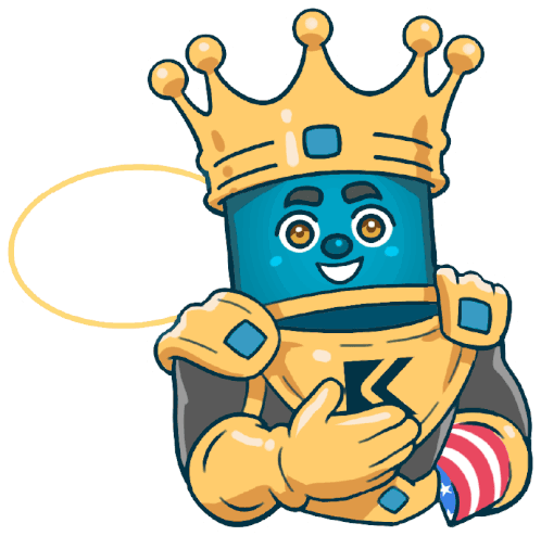a cartoon character wearing a crown and armor with the letter k on his arm