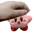 A cute animated sticker showing a hand gently petting the adorable pink Nintendo character, Kirby, as a plush toy.