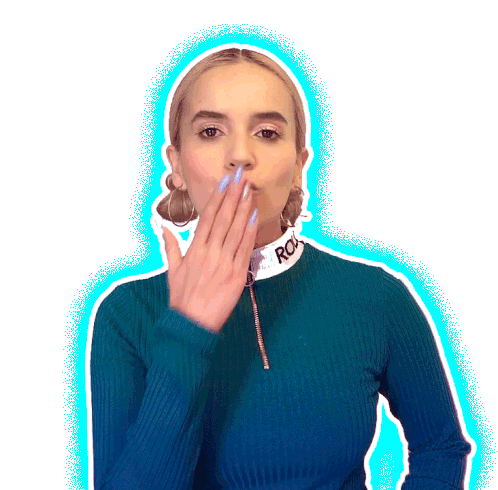 A young woman with blonde hair, wearing a green top, blows a sweet kiss towards the camera, perfect for expressing affection and love.