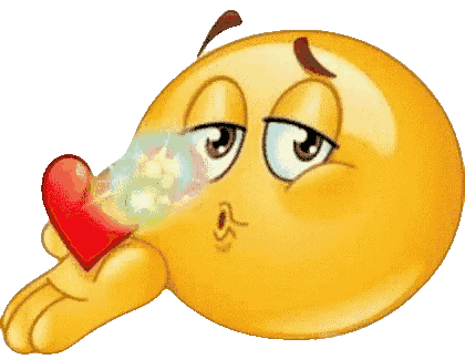 A cute cartoon smiley face blows a kiss with a red heart, sparkling with affection and love.