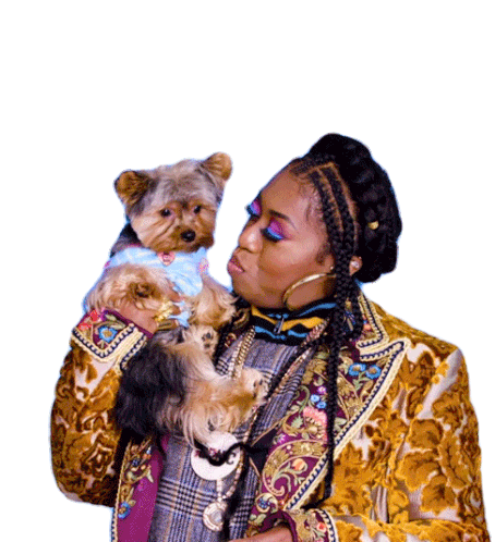 Missy Elliott shows affection to her small dog, holding it close and blowing a kiss. A sweet moment between a celebrity and her pet.
