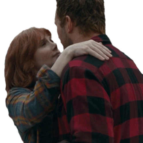 Claire Dearing shares a passionate kiss, embracing a man in a plaid shirt.