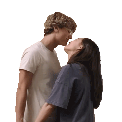 a man and a woman are kissing each other on a white background