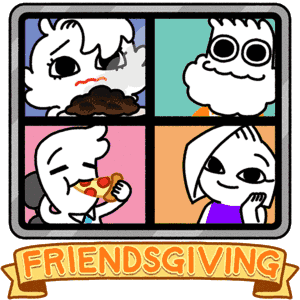 Kitkatandahalf's Mood Ochre, Cyan, Scarlett, and Violet characters celebrate Friendsgiving with turkey, pizza, wine, and some burnt food.