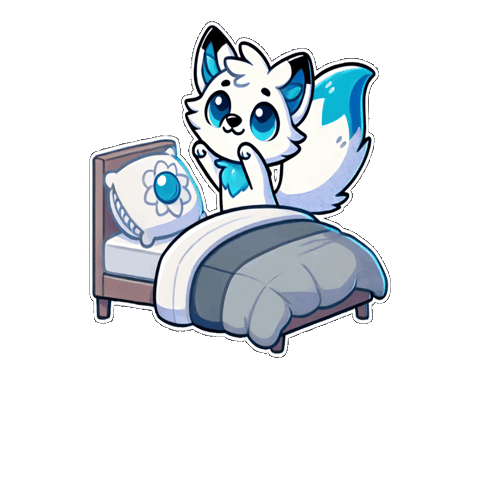 An adorable white kitsune fox with blue eyes and ears wakes up in a cozy bed, stretching its paws.