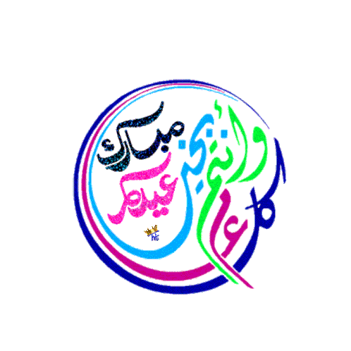 A vibrant animated circular sticker featuring Arabic calligraphy for Eid greetings, 'كل عام وانتم بخير عساكم من عواده,' with a glitter effect and a small crown.