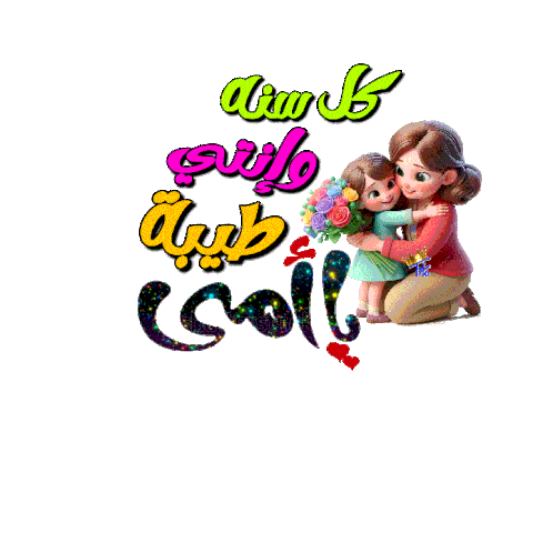 A heartwarming animated sticker featuring a mother hugging her daughter, with a vibrant Arabic greeting for Mother's Day.
