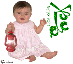 A cute baby in a pink dress holds a red lantern, smiling happily, with an Arabic festive greeting.