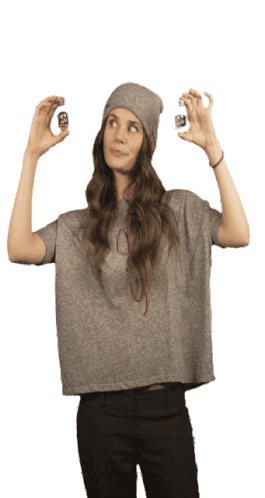 Joyce Ilg holding up two Kleiner Feigling shots, making a playful decision. Perfect for party invites and cheers.