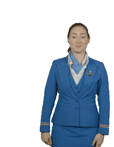 A KLM flight attendant in her blue uniform points to the side, then thoughtfully places her hand on her chin.