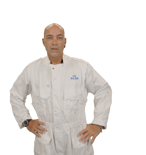 A bald man in a white KLM Royal Dutch Airlines jumpsuit gives a cheerful double thumbs-up, expressing approval and excitement.
