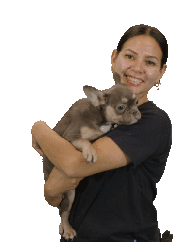 A woman lovingly hugs a small French Bulldog puppy, part of the Klm Royal Dutch Airlines collection.