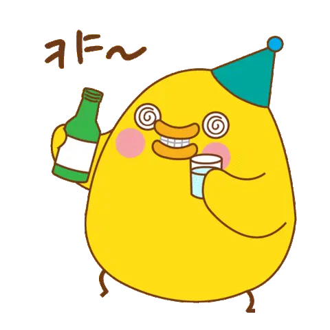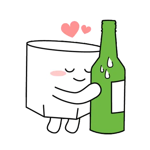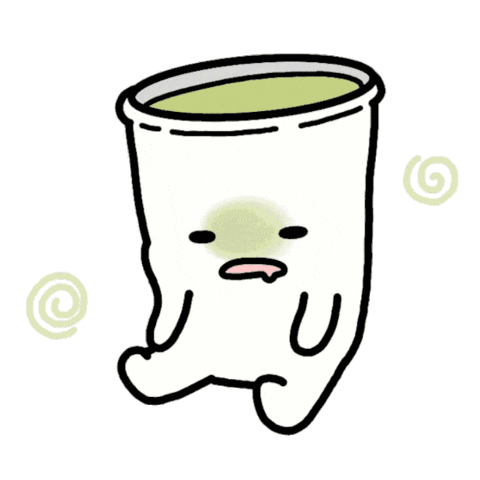 A cute, animated white cup with green liquid looking sick and dizzy, indicating a hangover or inebriation.