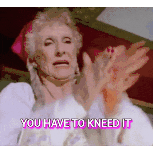 An elderly woman, possibly Firekat, demonstrates kneading a hot dog while saying 'You have to kneed it'.