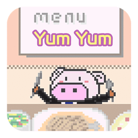 A pixel art pig in a suit holds knives, ready to enjoy a delicious 'Yum Yum' lunch from the menu.