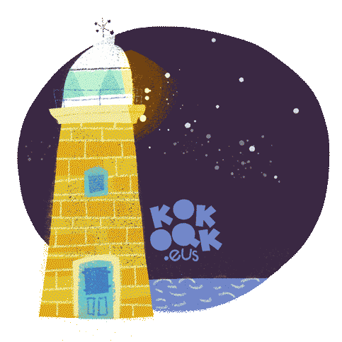 Animated lighthouse from Kokoak Mugi Muki, featuring 'itsas-argia' (Basque for lighthouse) and 'light house' text.