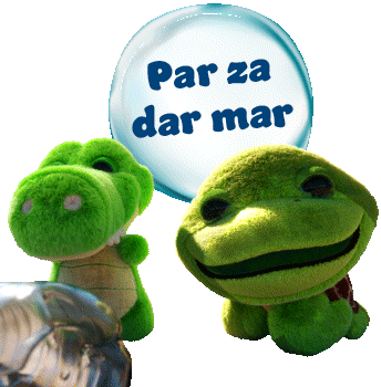 Green turtle and crocodile plush toys from Konzum Morsovci campaign share a loving hug, promoting a plastic-free sea.