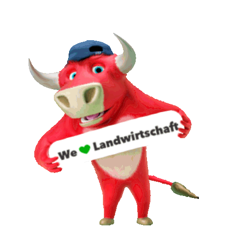 A cheerful red cartoon bull, wearing a blue cap, proudly holds a sign that reads 'We ❤️ Landwirtschaft'.