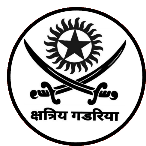 A dynamic emblem featuring crossed swords, a sun with a star, and 'Kshatriya Gadariya' text, changing colors.