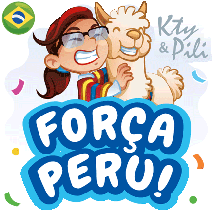 Kty and Pili cheer for Peru! A cartoon girl hugs a llama with 'Força Peru!' text, showing support for the country.