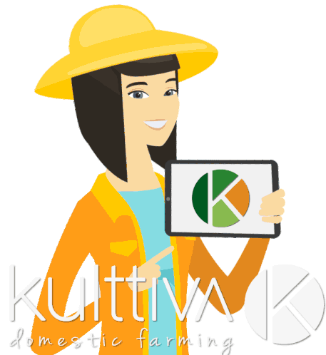 A smiling woman in a yellow hat presents a tablet displaying a 'K' logo and pie chart for Kulttiva Domestic Farming.