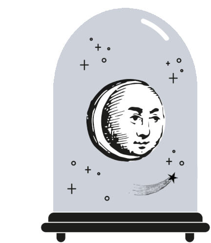 A whimsical La5e sticker featuring a moon face inside a glass globe, with a shooting star sparkling around it.