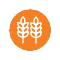 A clean white icon depicting two stalks of wheat, set within a vibrant orange circle, symbolizing lab agriculture.