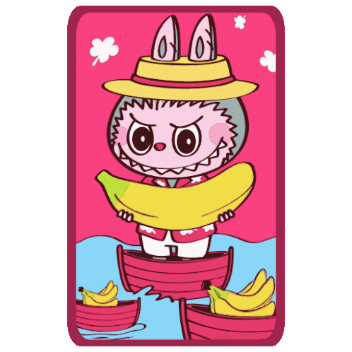 Labubu, the monster character, holds a giant banana while floating in a boat on water.