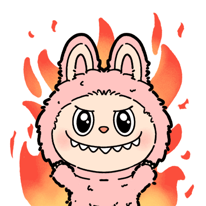 a cartoon of a pink bunny with flames behind him