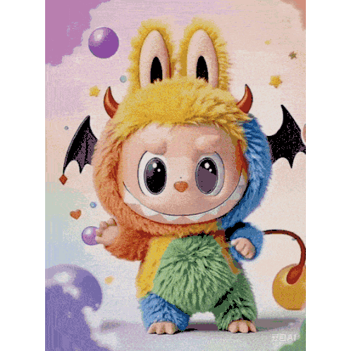 a stuffed animal with horns and bat wings is standing on a pink background