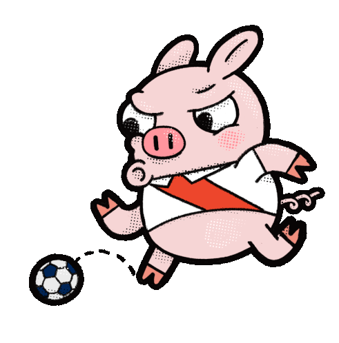 Laculpa Chanchito, the pig character, plays soccer in a River Plate jersey, kicking a ball with determination.
