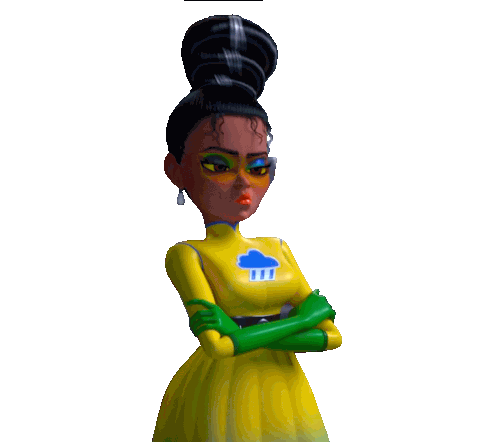 a cartoon character wearing a yellow dress and green gloves with a blue cloud on her chest