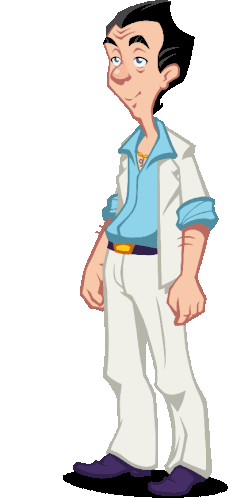 Larry Leisure Suit Larry, dressed in his iconic white suit, sprays cologne with a confident smile.