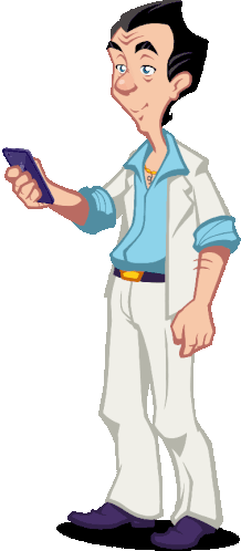 Leisure Suit Larry, the iconic character, holds a cellphone with a confident, charming expression.