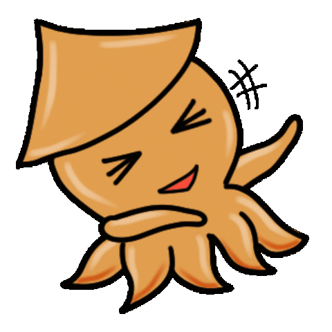 A cheerful orange cartoon squid character is shown laughing heartily with closed eyes and a wide smile, expressing great amusement.