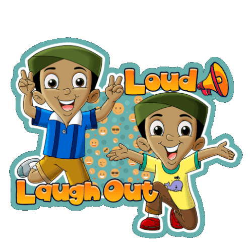 Dholu and Bholu from Chhota Bheem are laughing joyfully, making peace signs and spreading happiness.