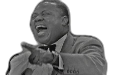 Iconic jazz musician Louis Armstrong captured in a joyful, hearty laugh, showcasing his famous infectious smile.