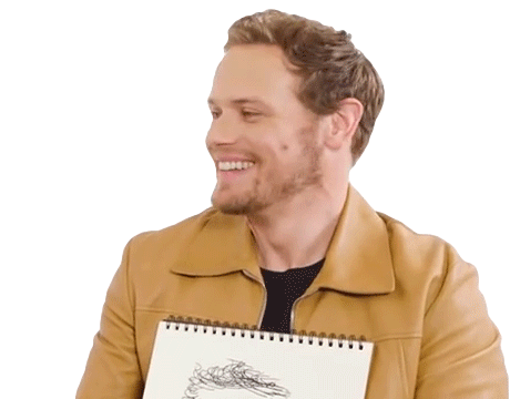 Sam Heughan laughs while holding a notebook with a drawing, likely during a Harpers Bazaar interview.
