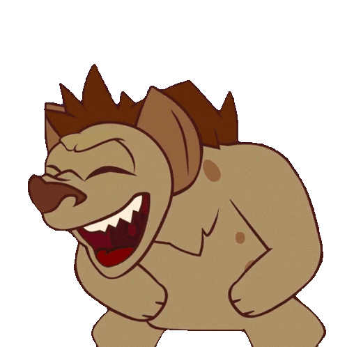 A cartoon werewolf or hyena character, possibly from Om Nom Stories, laughs hysterically with its mouth wide open.