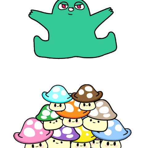 A cute green monster with a crown laughs joyfully, surrounded by adorable, smiling mushroom characters.