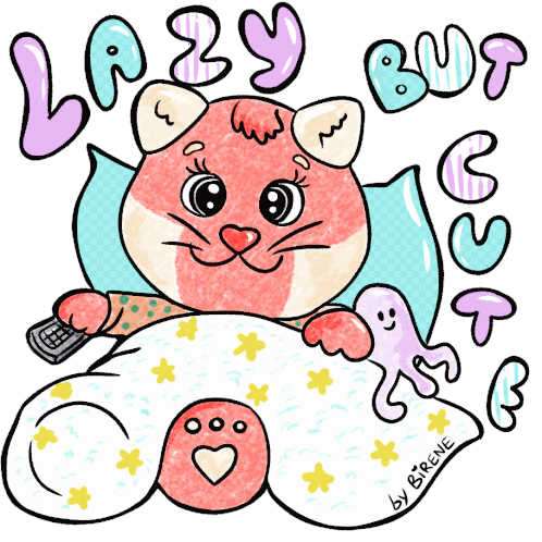 A cute animated red panda by Birene, lounging in bed with a remote and plushie, with 'Lazy But Cute' text.